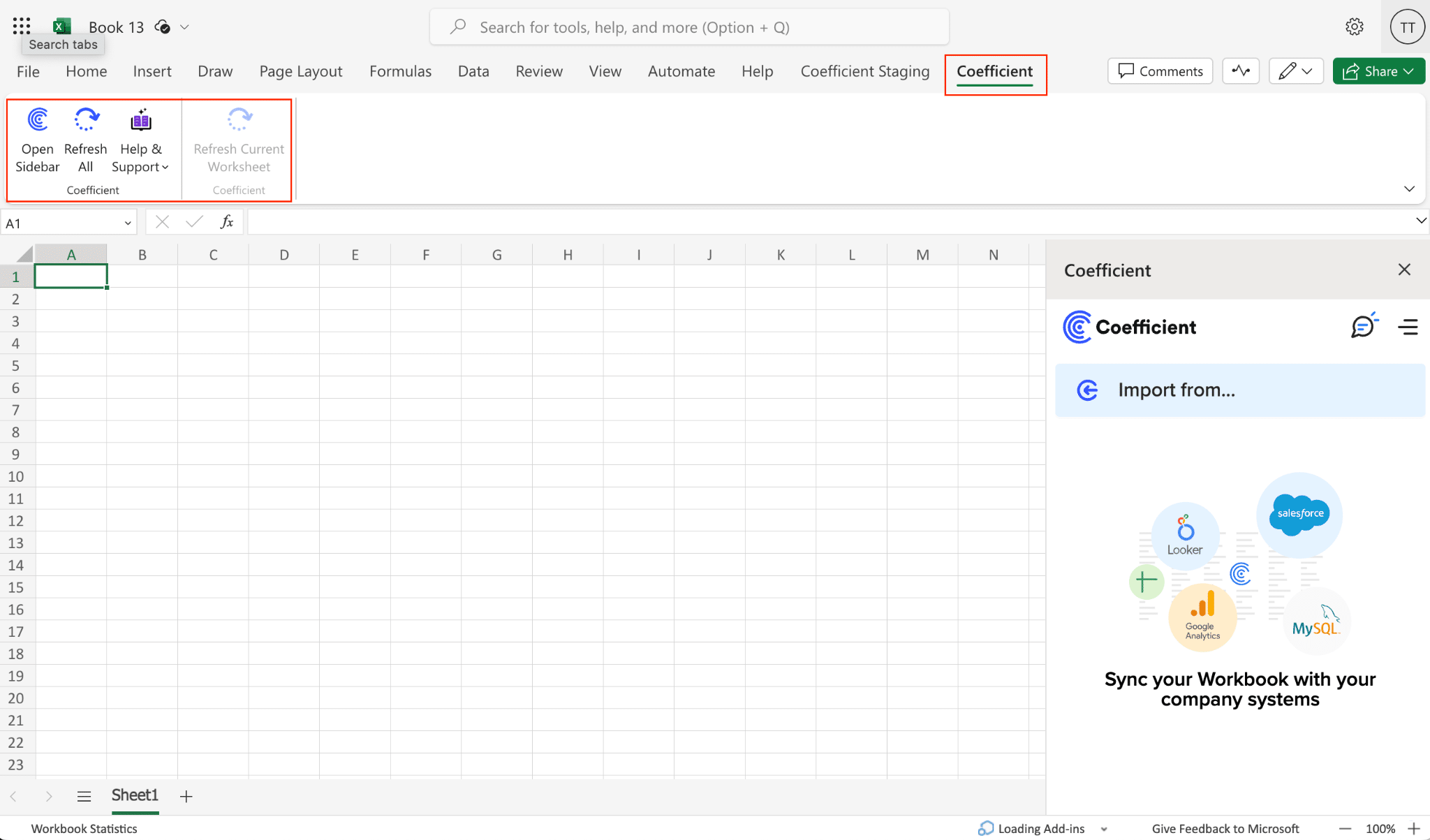 Open Coefficient in Excel Open your Google Sheet and launch the Coefficient add-on from the Add-ons menu.