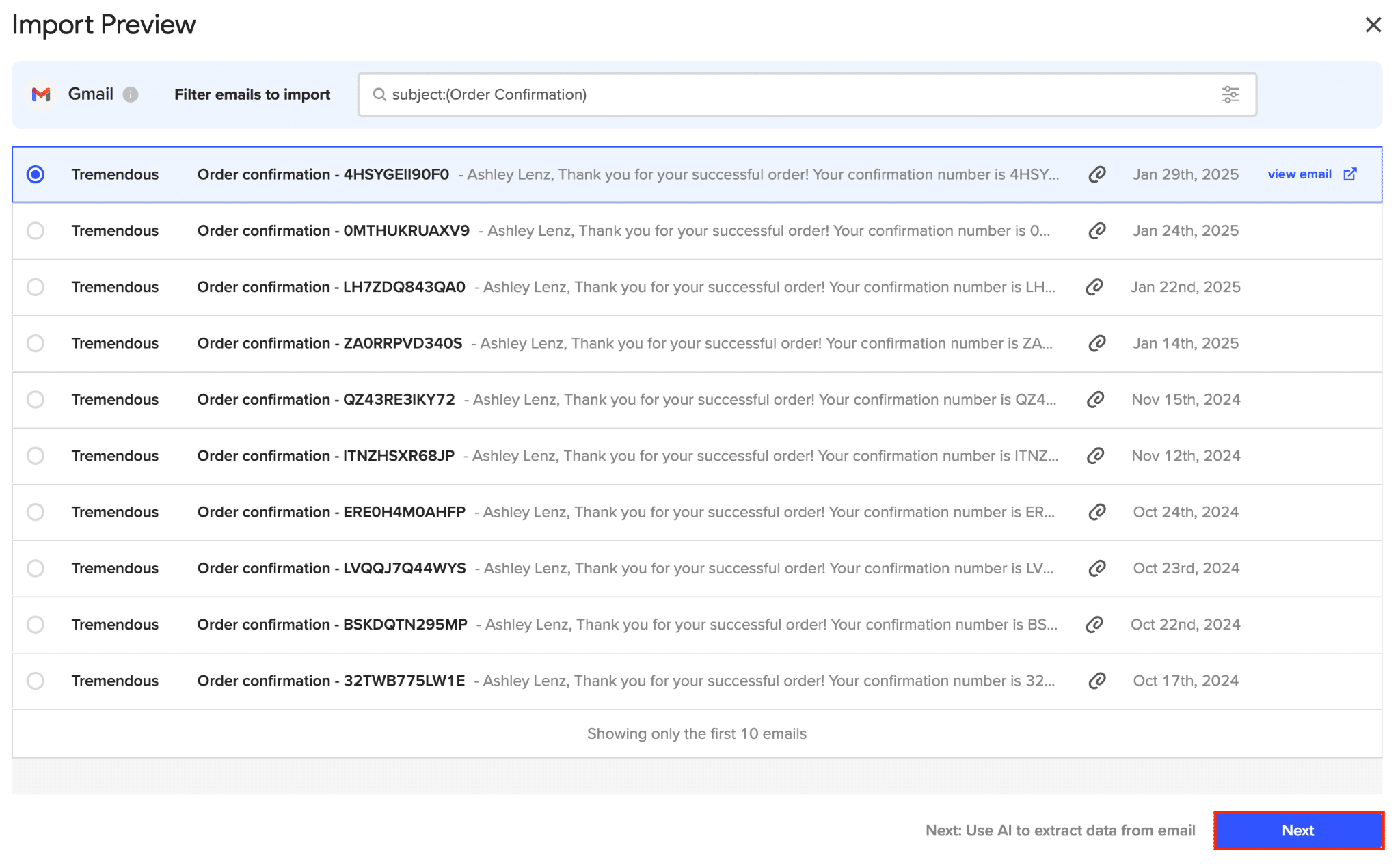 3. Monitor order confirmations: Import order confirmation emails to track sales trends and customer purchasing patterns.