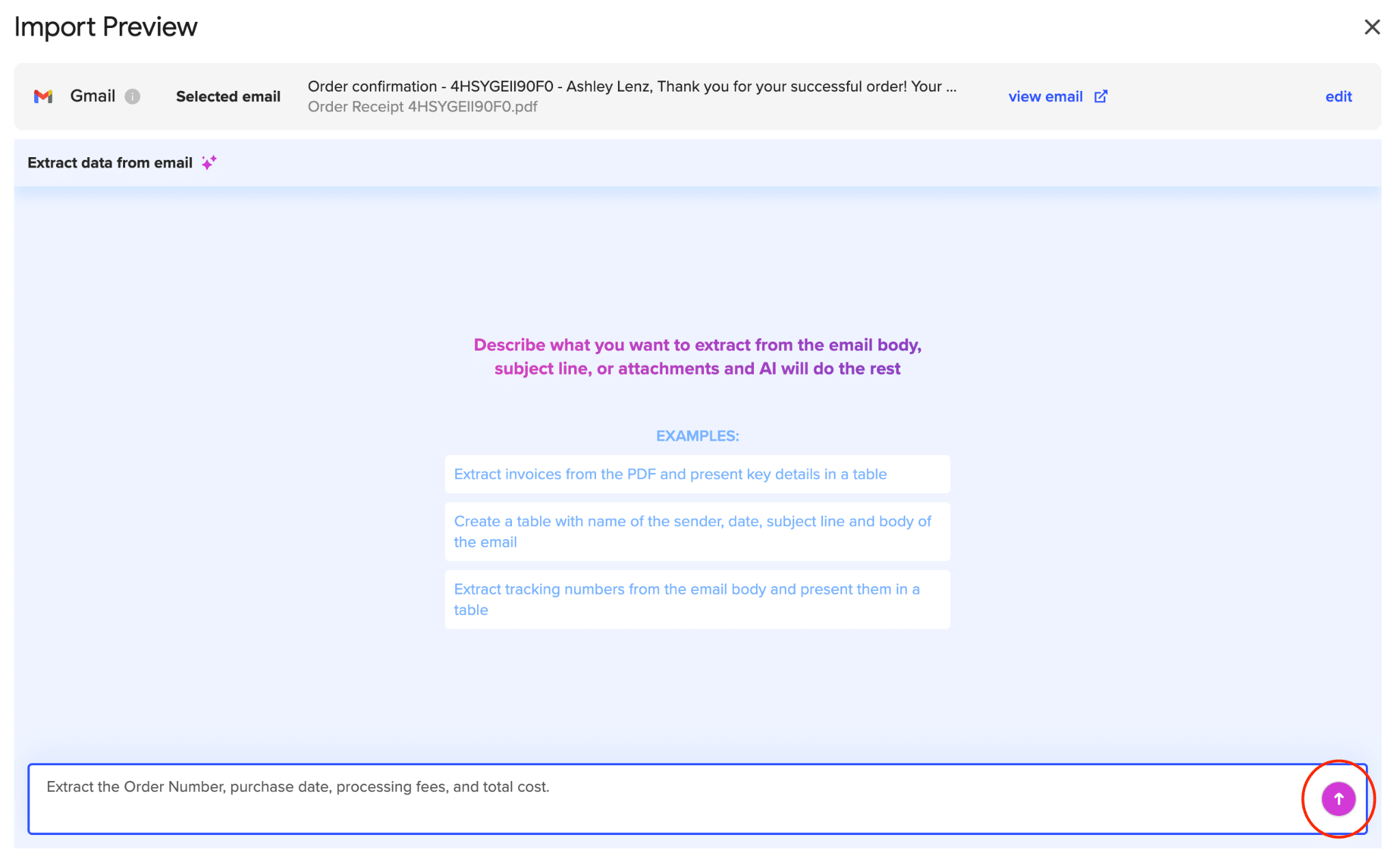 Write a prompt to extract the information you need, such as order numbers, dates, or transaction amounts.
