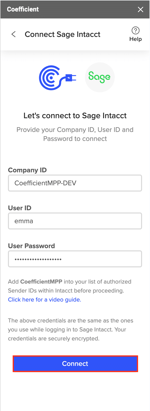 Provide your company ID, user ID, and password to connect Coefficient to Sage Intacct.