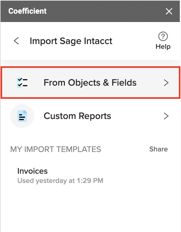Choose between importing from objects and fields or custom reports. For this tutorial, we’ll use objects and fields.