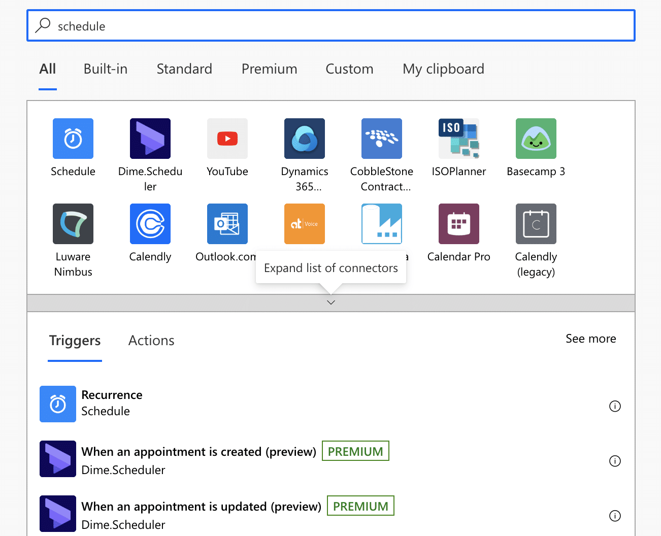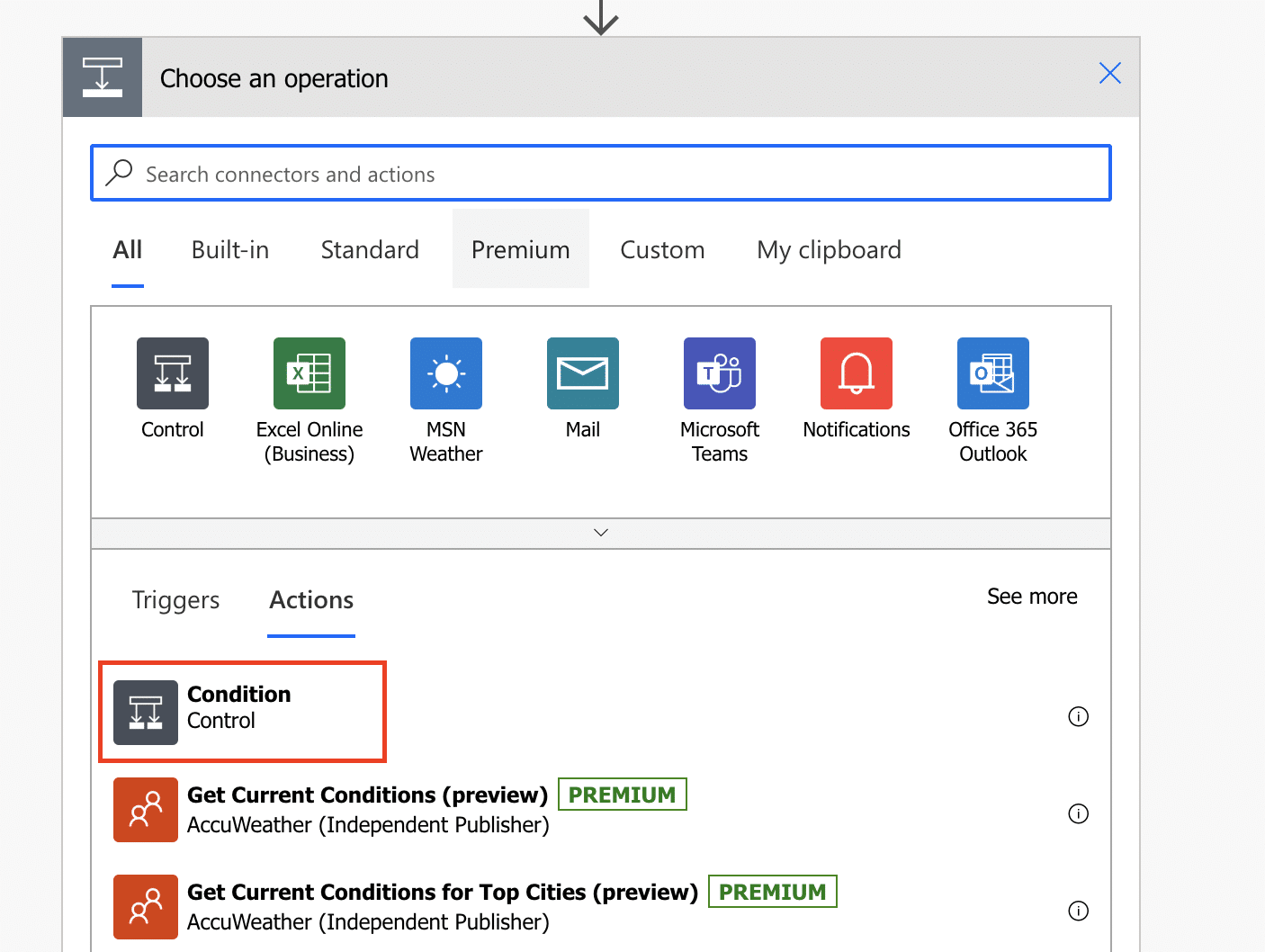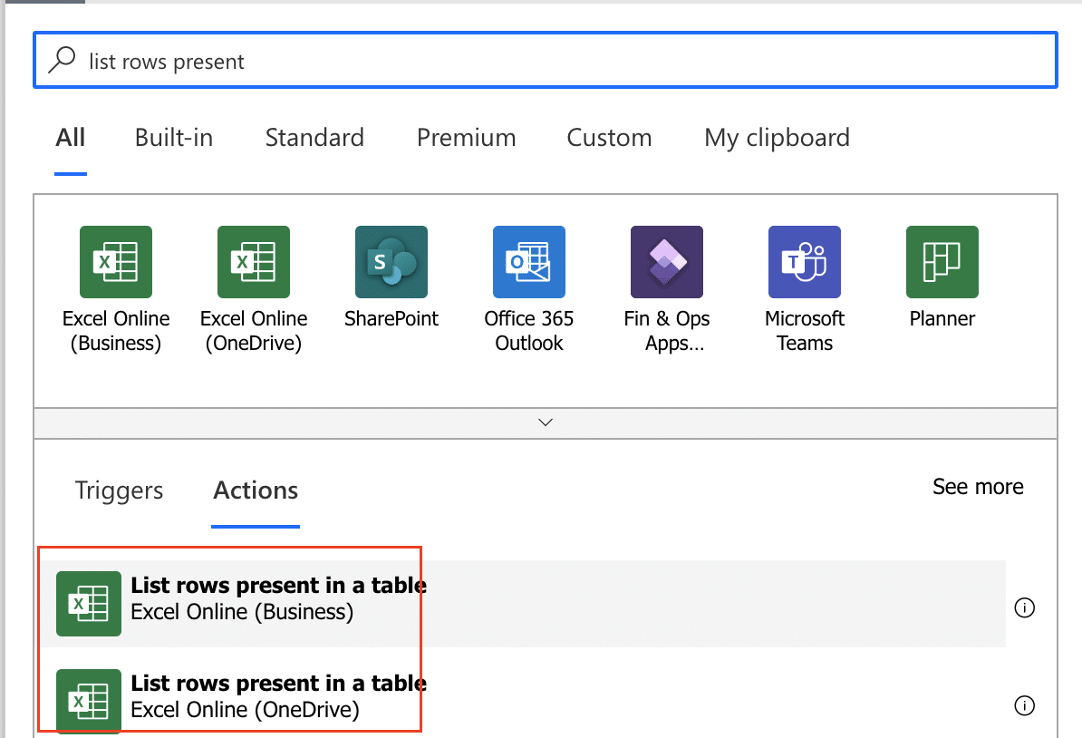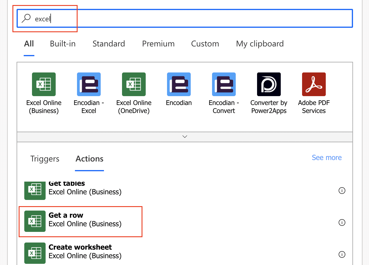 • In the trigger selection screen, search for “Excel” in the connector list.