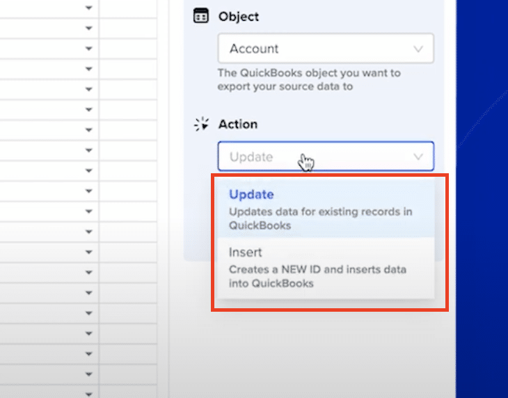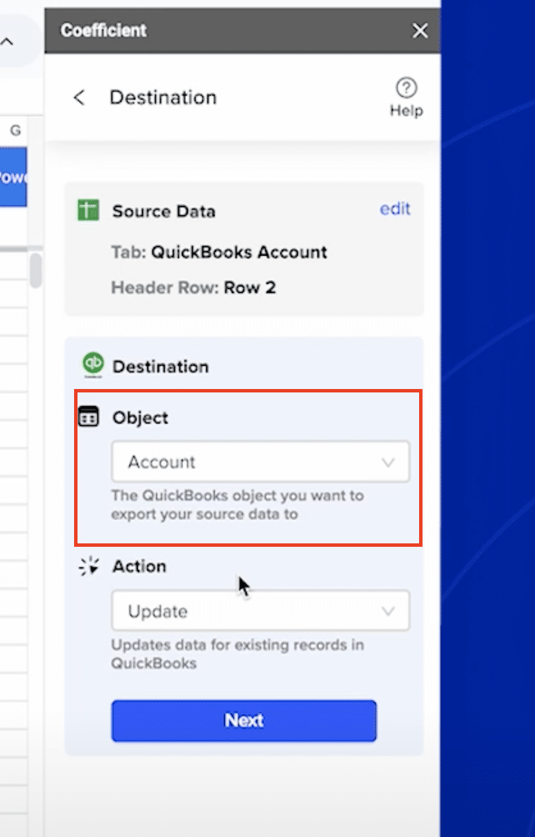 - In Coefficient, choose the “Accounts” object from QuickBooks Online.