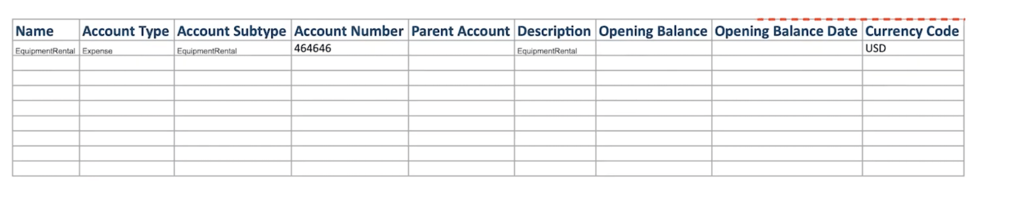 - Create an Excel or CSV file with your chart of accounts.