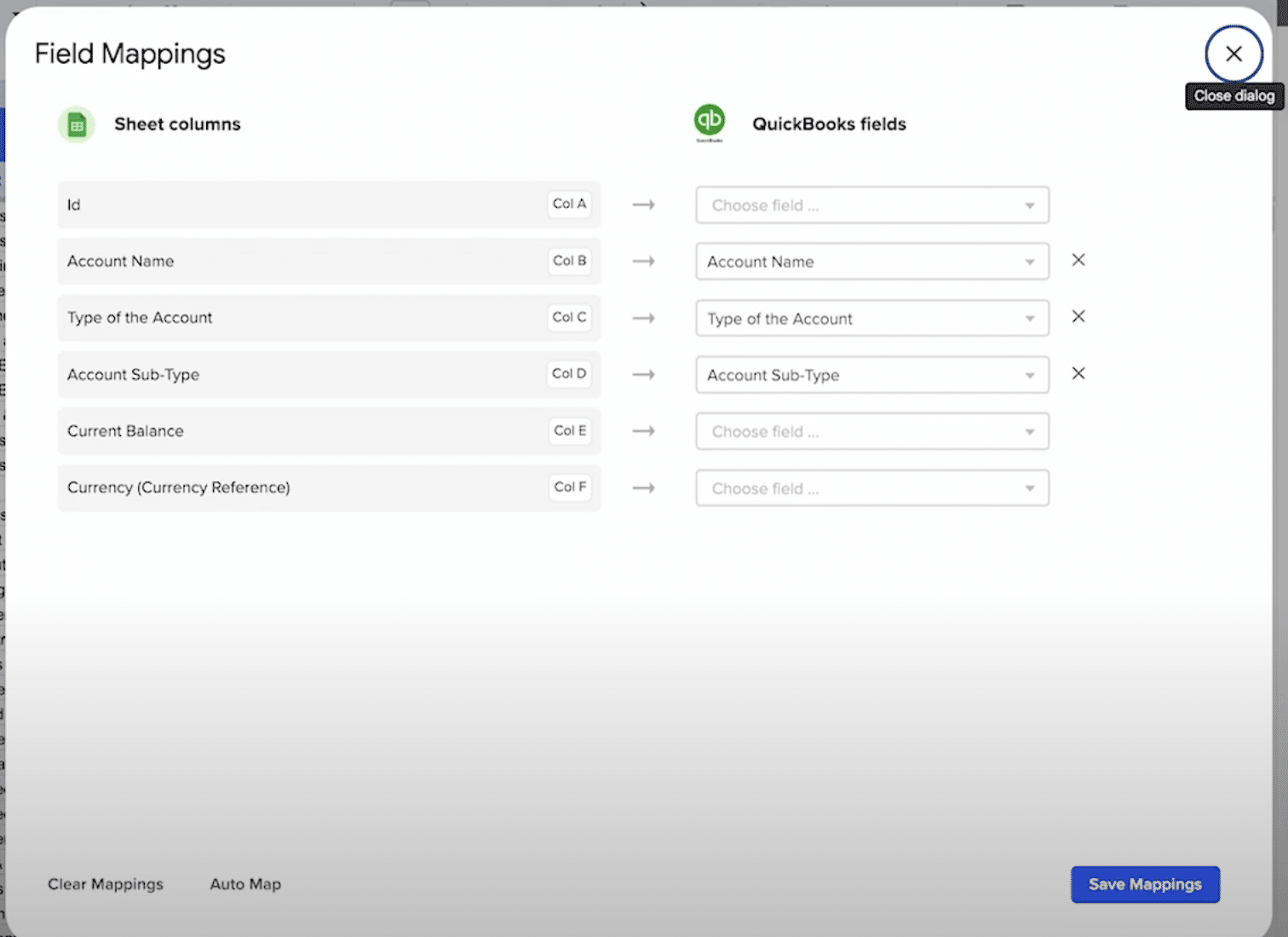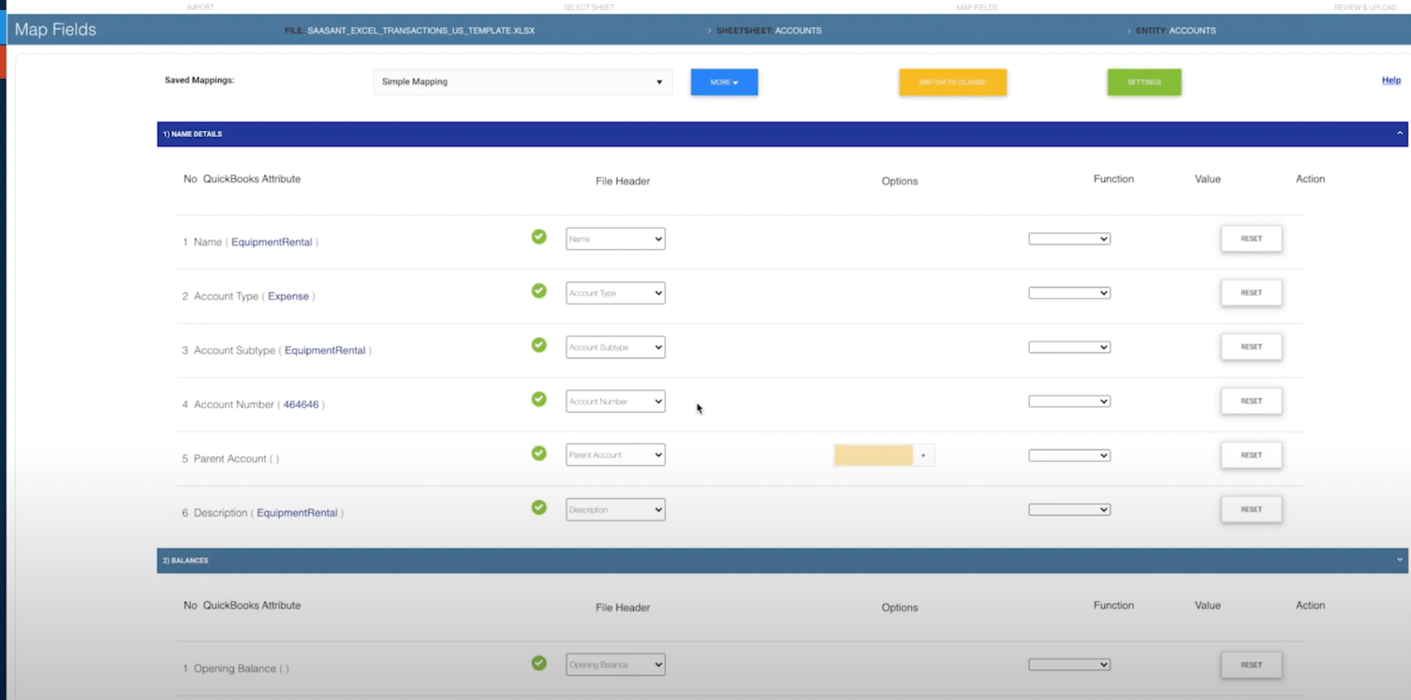 - Map the fields from your spreadsheet to QuickBooks Online fields (e.g., account name, type, subtype).