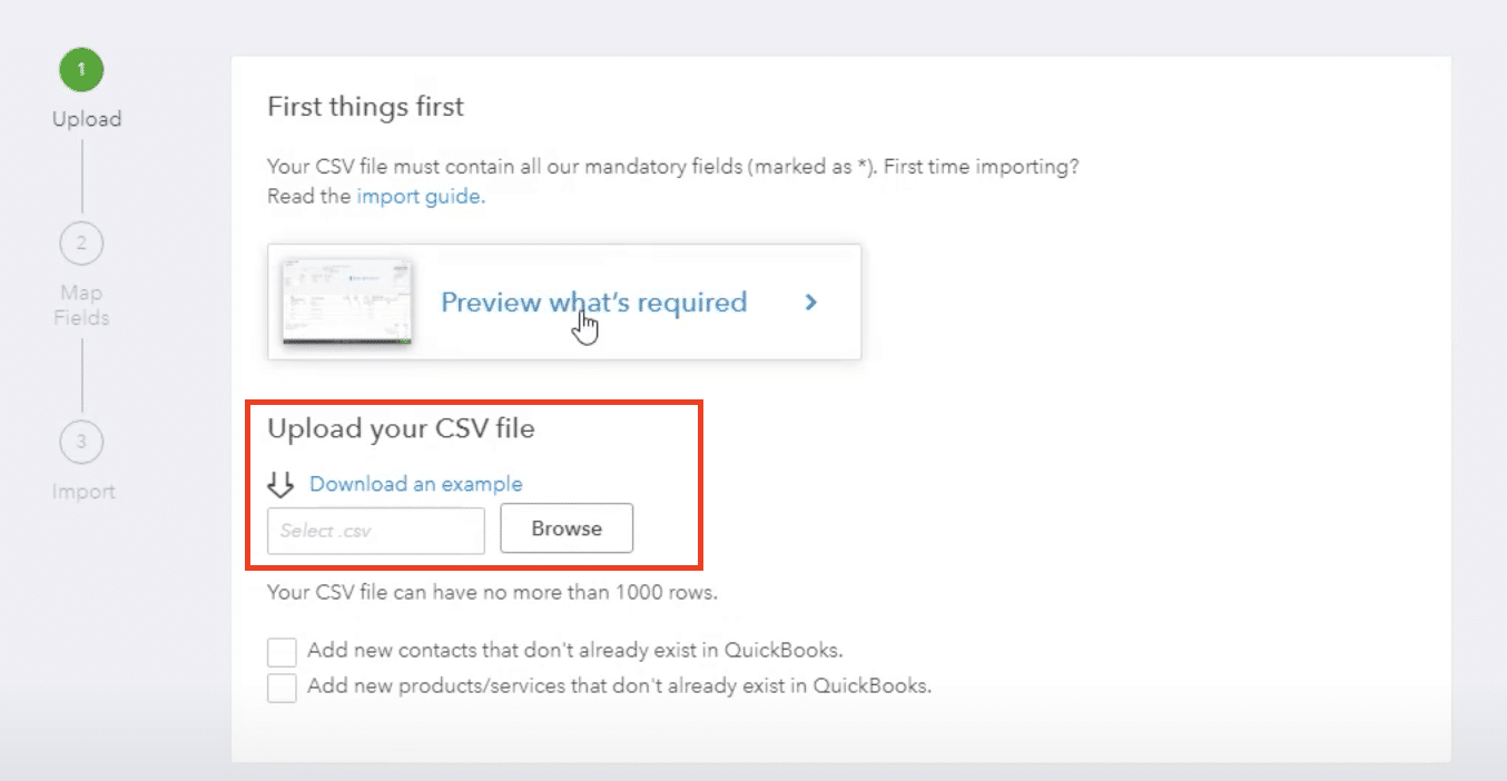 - Match the columns in your file to the corresponding QuickBooks fields.