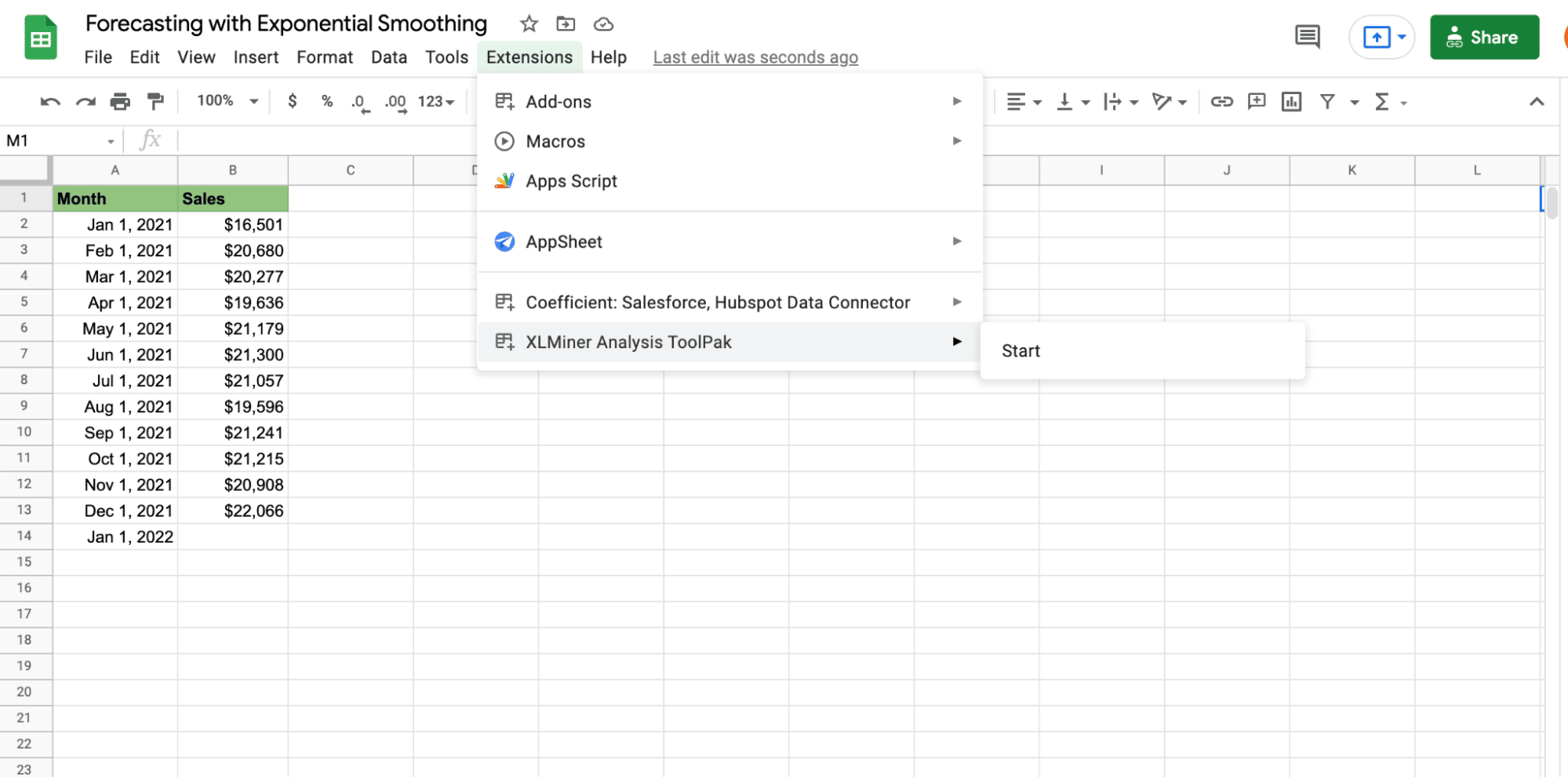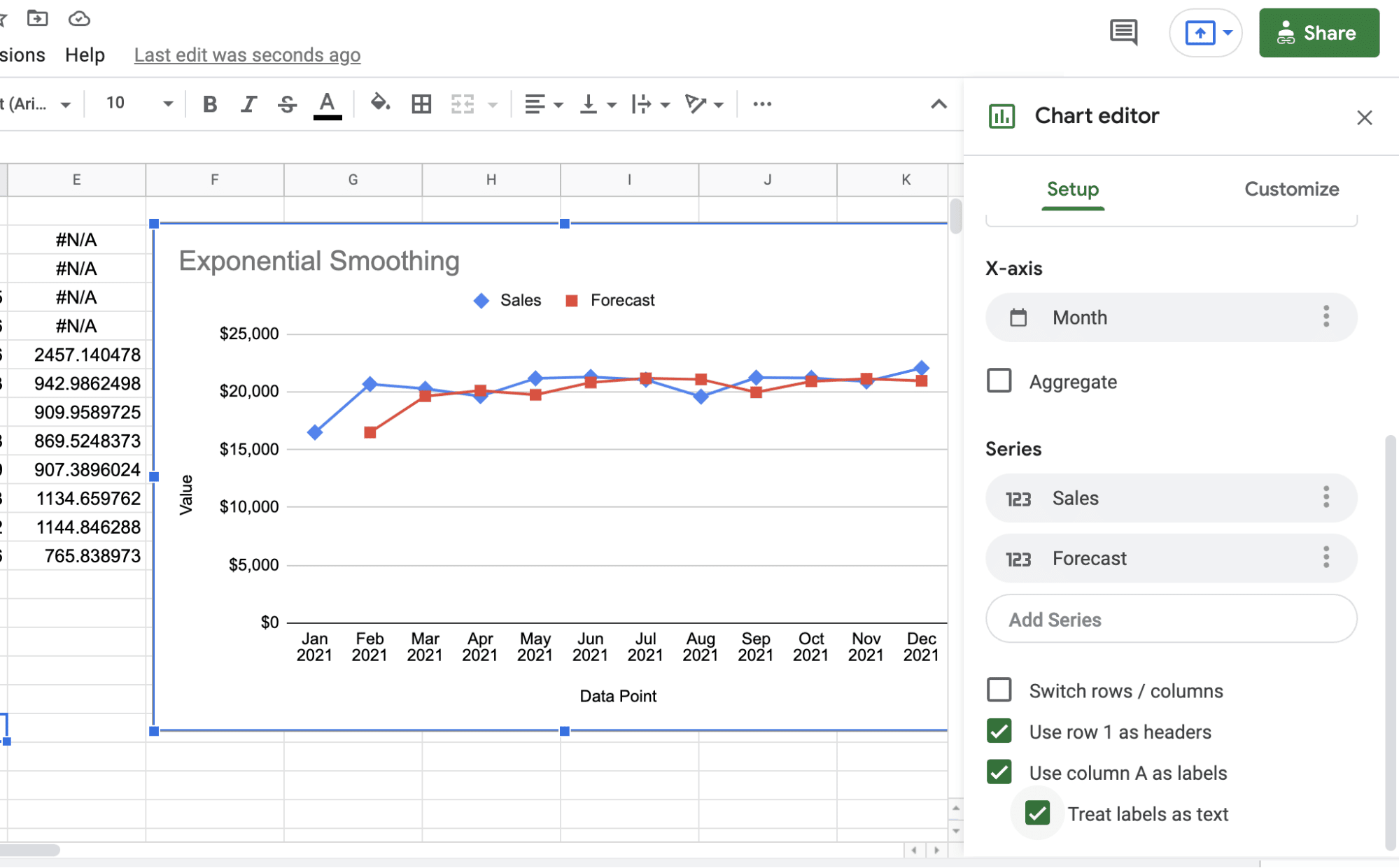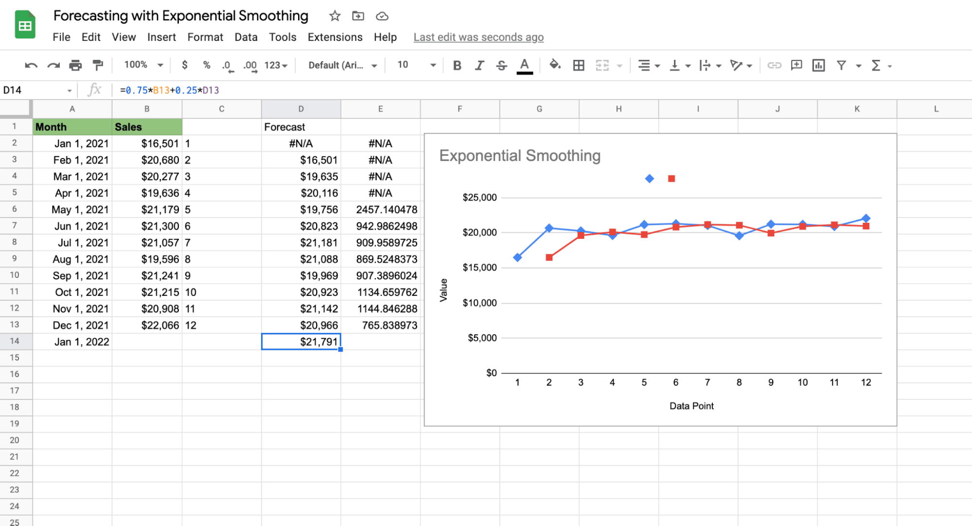 Follow the steps below to conduct your first sales forecast in Google sheets using the exponential smoothing technique.