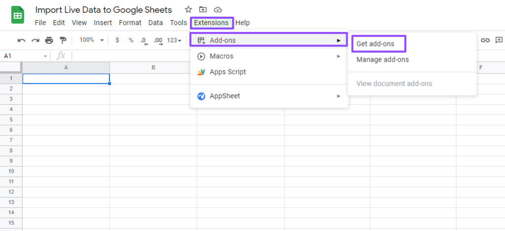 Install the Coefficient app to Google Sheets by clicking Extensions > Add-ons > Get add-ons on the top menu.