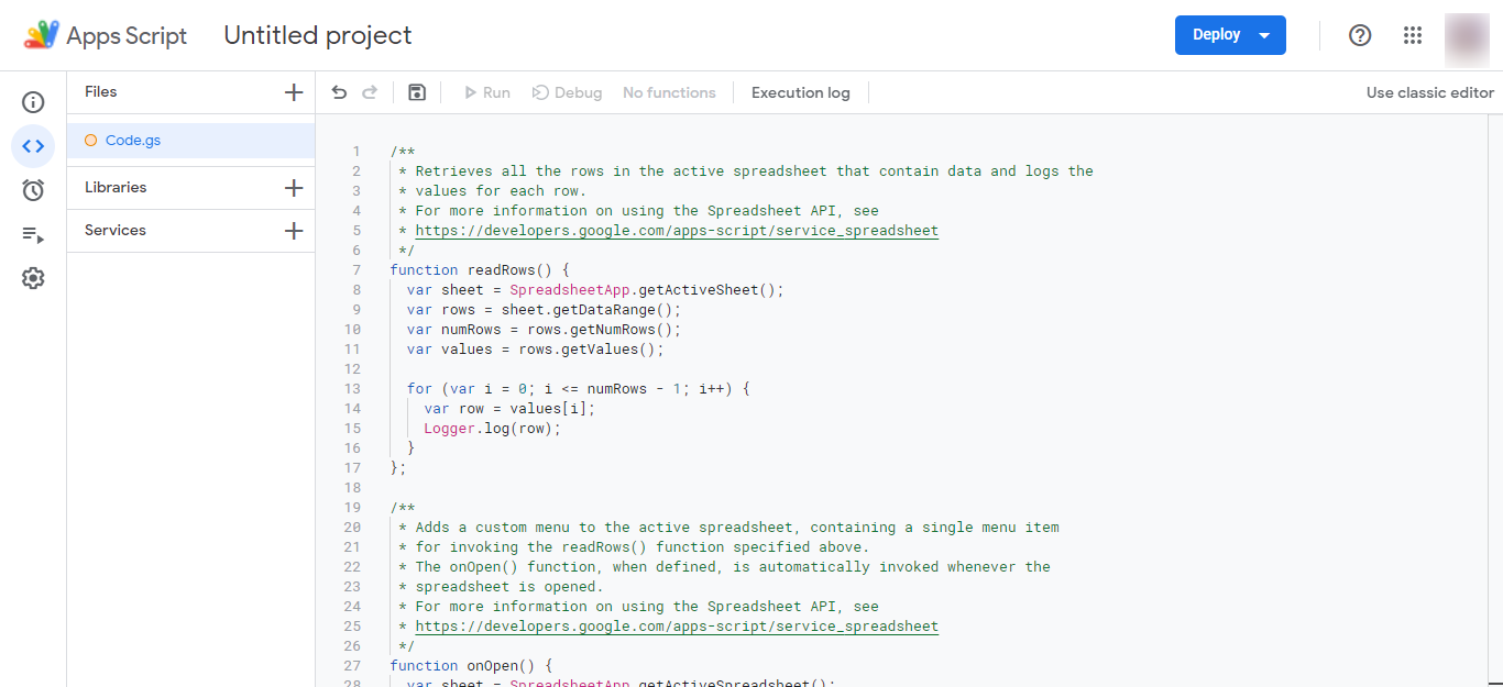 The final method for importing live data into Google Sheets is Google Apps Script, a code-based option. Apps Script is a scripting platform for light-weight application development in Google Workspace. The scripting platform is based in JavaScript, and helps teams automate tasks across Google products.