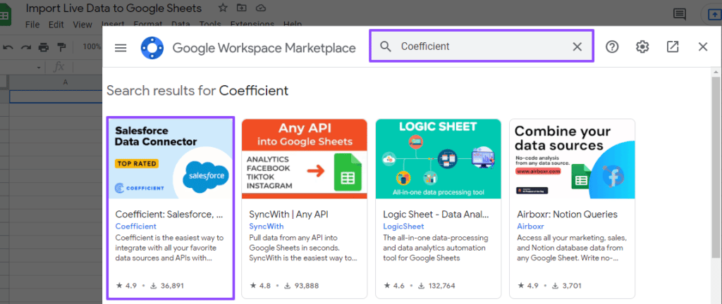Type in Coefficient in the Google Workspace Marketplace search box and click the app to install it.