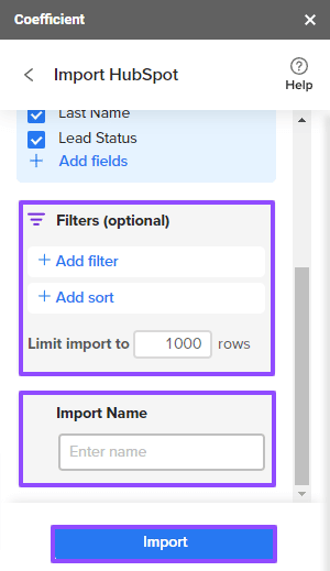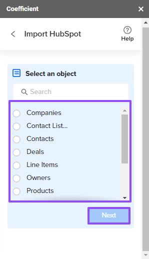 Authorize the connection to HubSpot and allow Coefficient access to your HubSpot data. Then select an object from your HubSpot data to import.