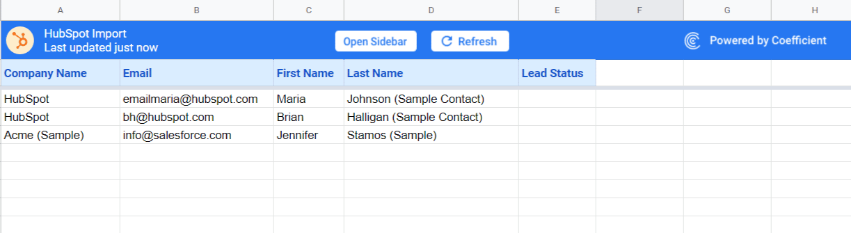 After clicking Import, your live data from HubSpot will populate in your spreadsheet near instantly.