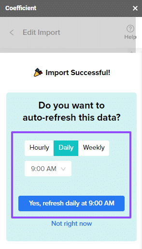 Coefficient’s Auto-Refresh feature syncs data in HubSpot with Google Sheets. You should schedule automatic data refreshes to ensure that the HubSpot data in your spreadsheet always remains live.