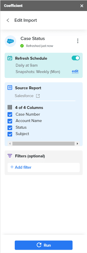 With Google Sheets, you’ll have the familiar functions and features of spreadsheets while leveraging the power of Coefficient. You won’t need to map object fields as you would in Salesforce, with Coefficient doing most, if not all, the heavy lifting for you. If you don’t have admin access, no problem. Any user with the right credentials can run the snapshot. The best part is, you can automate the entire process. Set it up once, and you’ll get the data you need when you need it, saving you huge chunks of time and energy.