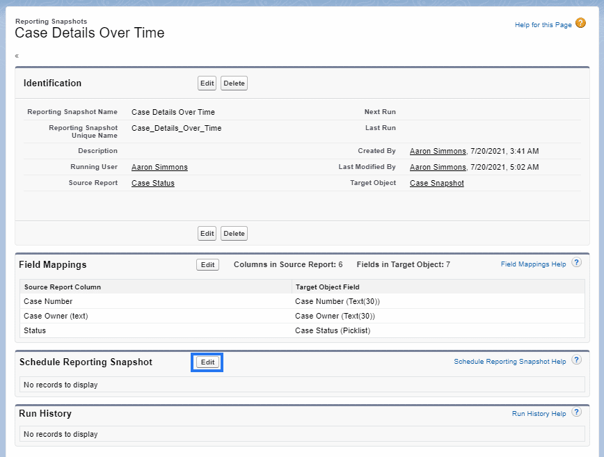 The steps below outline how to set up reporting snapshots in Salesforce.