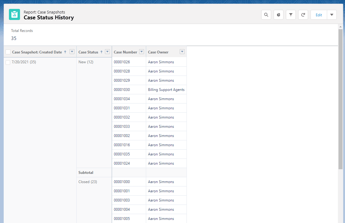 Step 1: Create a Report containing the data you want to use. If we’re building a report to see how cases change over time, you might want to include fields such as Case Number, Case Status, and Case Owner at a minimum.