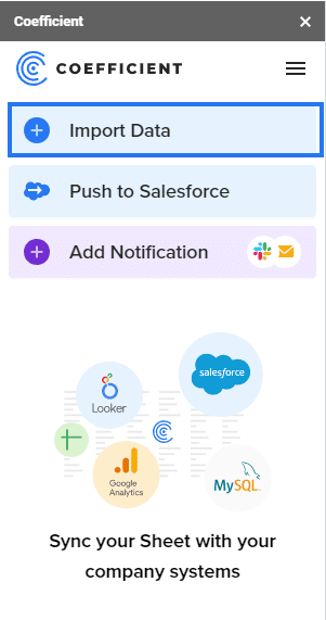 Step 2: On the Google Sheets menu, launch the Coefficient Sidebar and click Import Data.