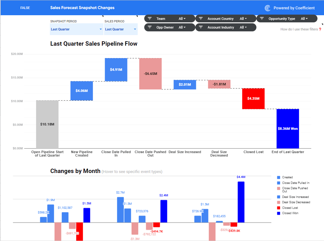 Coefficient’s Opportunity History Template enables you to track sales forecast changes directly from Google Sheets. The template shows how new sales pipelines, lost opportunities, changing close dates, and up-sells impact your bottom-line revenue streams.