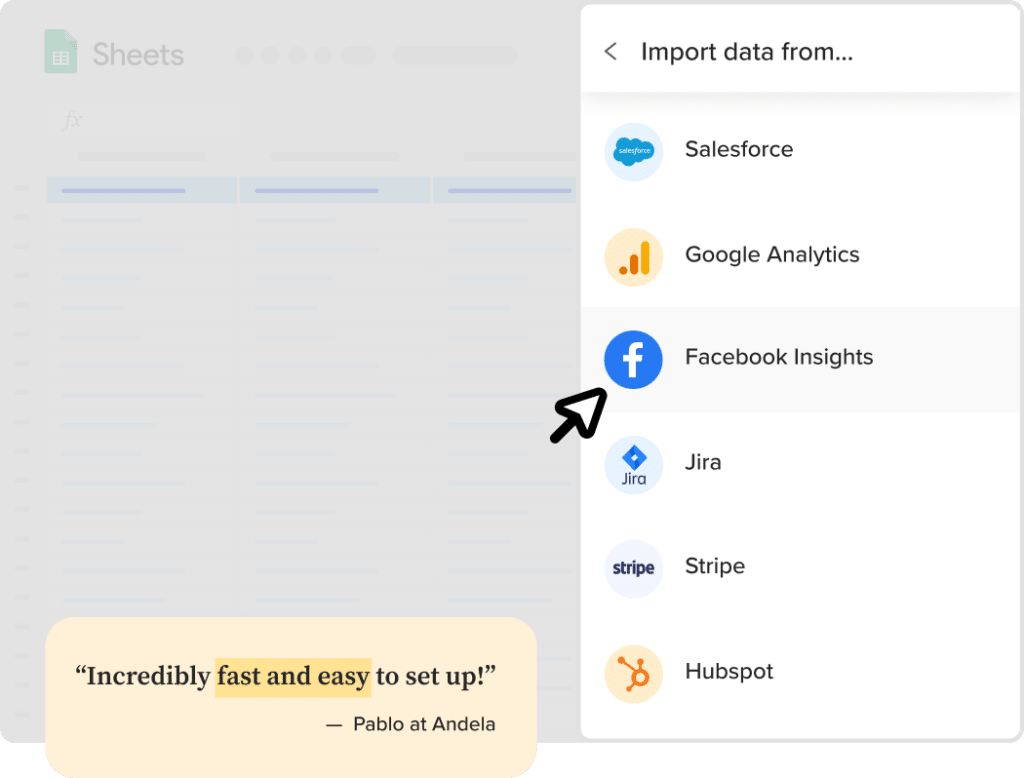Connect your live Facebook data to Sheets in less than 60 seconds.