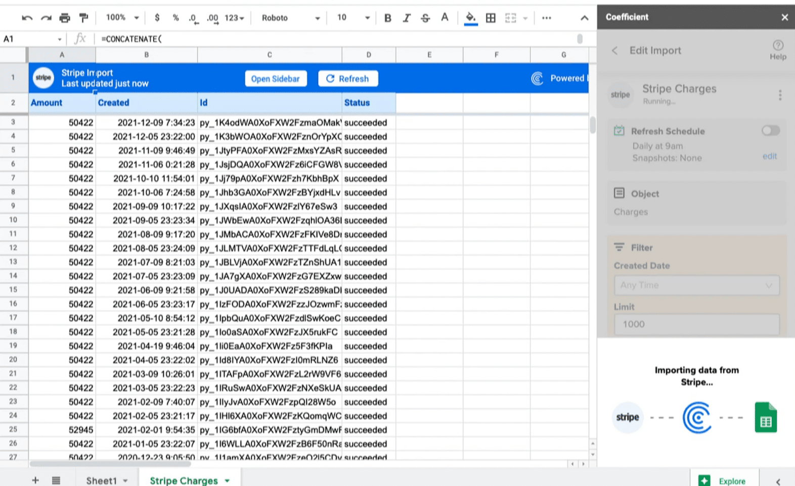 - The only current “downside” of using Coefficient is that it’s not totally free. You can try out the app for free but with limited imports and access to features. However, the benefits and convenience of investing in the Coefficient app can more than make up for the costs. It can significantly cut down on the time and resources spent pulling and syncing your Stripe data on Google Sheets.