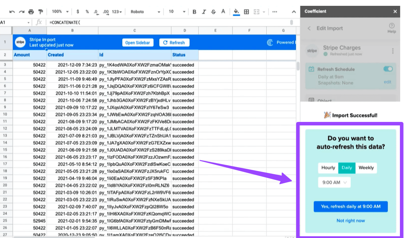 - You can also automate syncing your Stripe data in Google Sheets by setting an auto-refresh schedule so you won’t have to update anything manually. This allows your team to work more efficiently and shift your time and resources to more critical tasks.