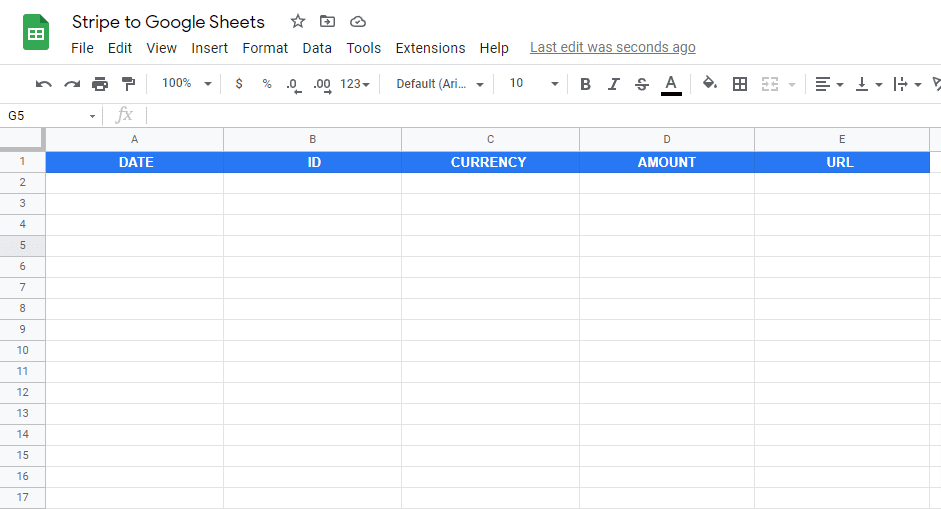 You can set up your Google spreadsheet to track and log the Stripe data you want. For this example, the data includes the date, currency, ID, amount, and URL.