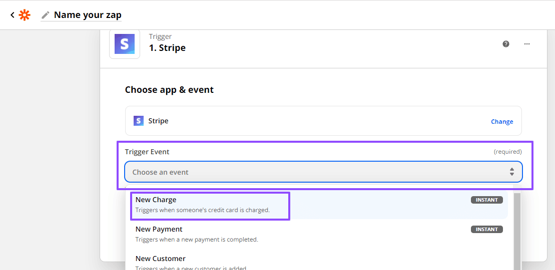 Step 3: Configure your Stripe trigger step or event in Zapier. Type in Stripe in the app event search box, then select the app.