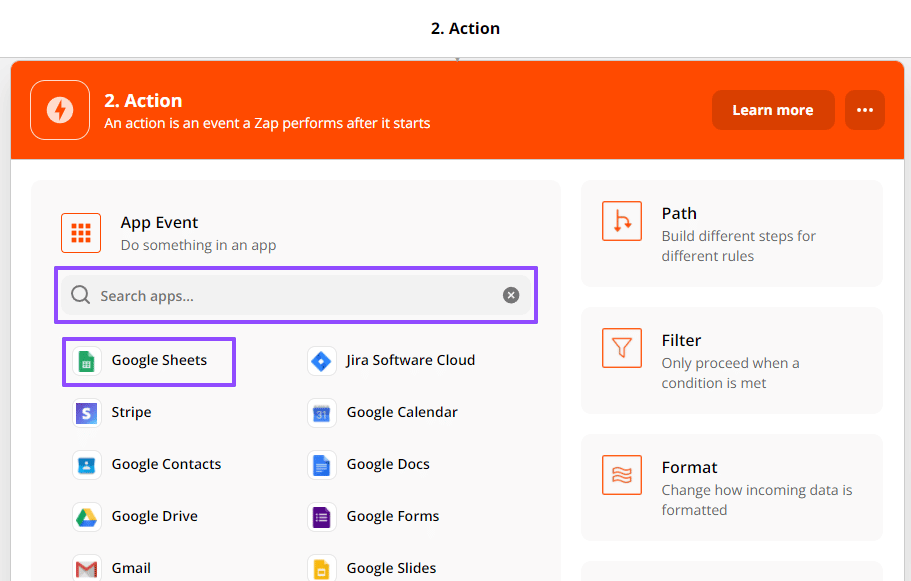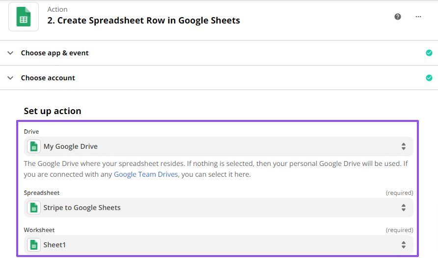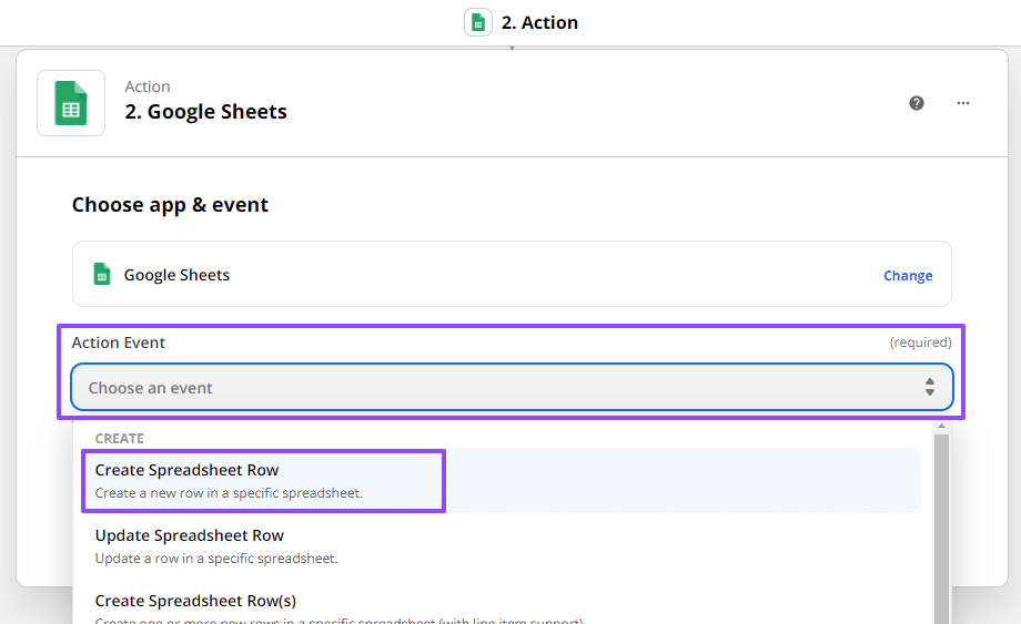 Step 4: Set up your Google Sheets Action step or the event a Zap performs after it starts.