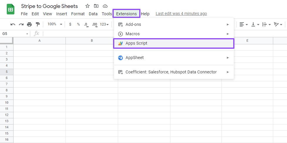 Click Extensions > Apps Script on the Google Sheets top menu to create your script.