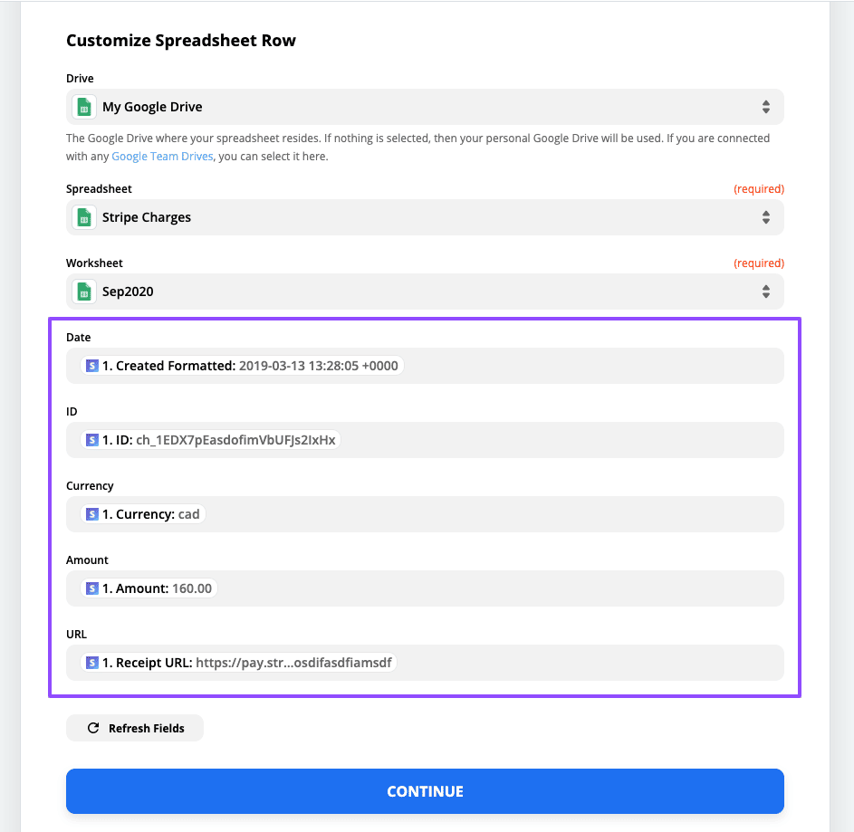Step 6: Populate your spreadsheet by selecting your Stripe trigger’s payload values.
