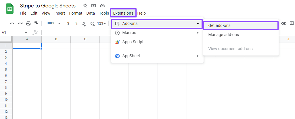 Step 1: Install the Coefficient Add-on from the Google Workspace Marketplace or Signup with Google here. Navigate to the top menu of your Google spreadsheet and click Extensions > Add-ons > Get add-ons.